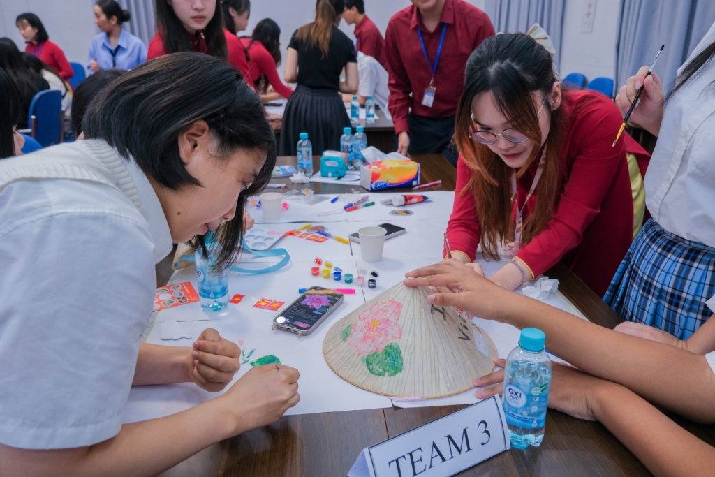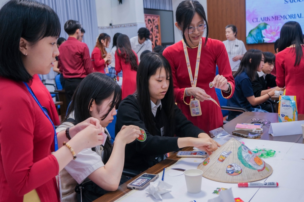 Học sinh Trường Quốc tế Clark Memorial và sinh viên Trường Đại học Sài Gòn tham gia phần thi trang trí nón lá