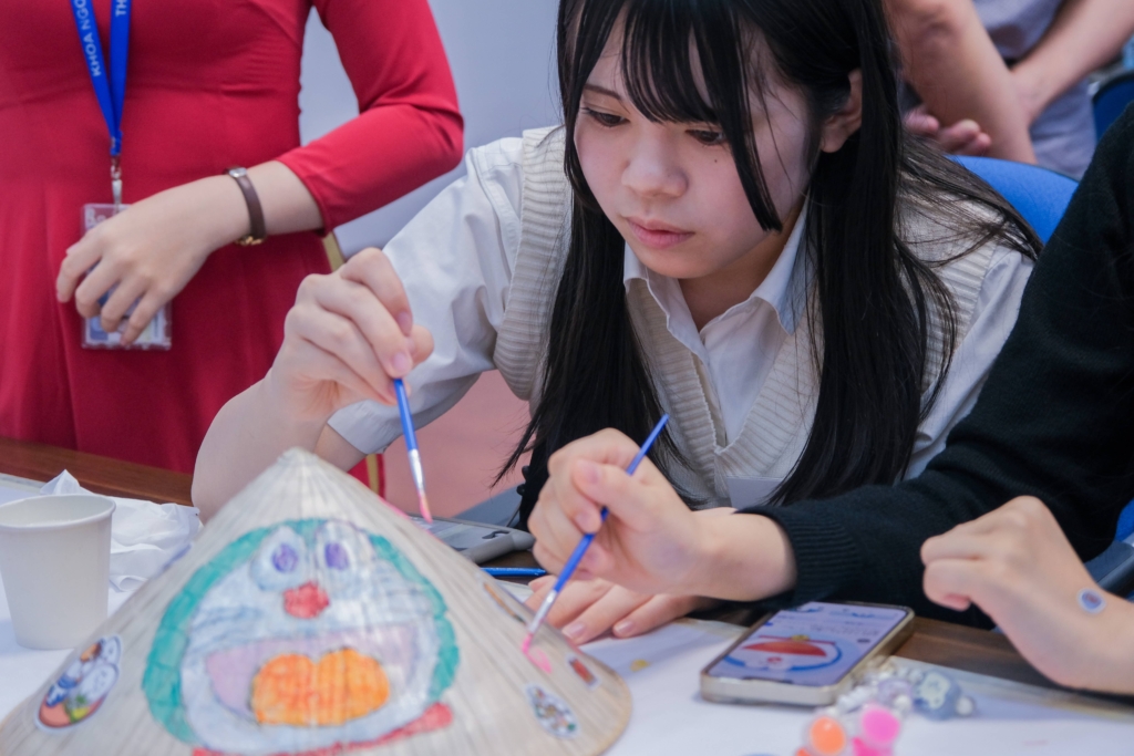 Một trong những điểm nhấn nổi bật của chương trình là phần thi trang trí nón lá – một vật dụng bình dị nhưng mang tính biểu tượng. Hoạt động này không chỉ tạo nên bầu không khí sôi nổi, mang lại nhiều tiếng cười và ấn tượng đẹp mà còn giúp học sinh Nhật Bản hiểu thêm về ý nghĩa của chiếc nón lá trong đời sống văn hóa Việt. Thêm vào đó, học sinh Trường Quốc tế Clark Memorial cũng mang đến buổi giao lưu phần giới thiệu trò chơi dân gian Fukuwarai, một trò chơi truyền thống của Nhật Bản tượng trưng cho sự may mắn và niềm vui đầu năm, góp phần tăng thêm sự thú vị và tính giao lưu tương tác trong chương trình.
