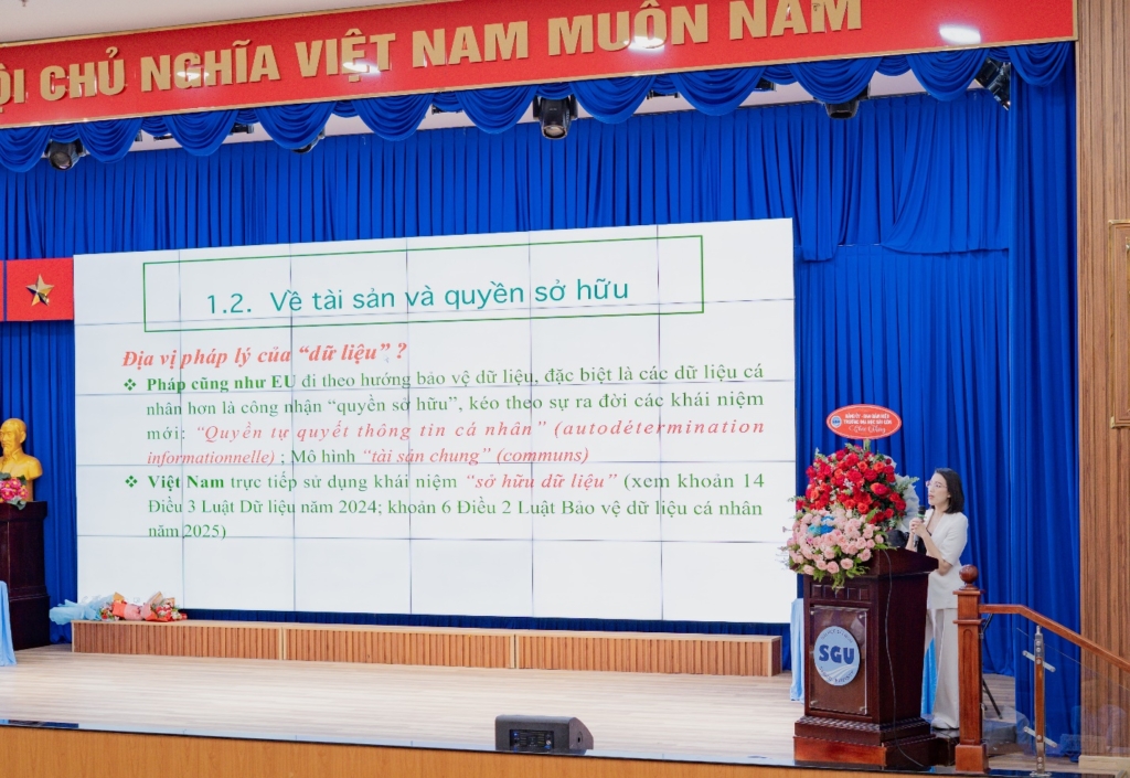TS. Vũ Thị Diệu Thúy – Giảng viên Khoa Luật Dân sự, Trường ĐH Luật TP. HCM trình bày tham luận “Pháp luật dân sự trong kỷ nguyên số và hướng đi mới trong đào tạo luật – Kinh nghiệm từ Pháp”