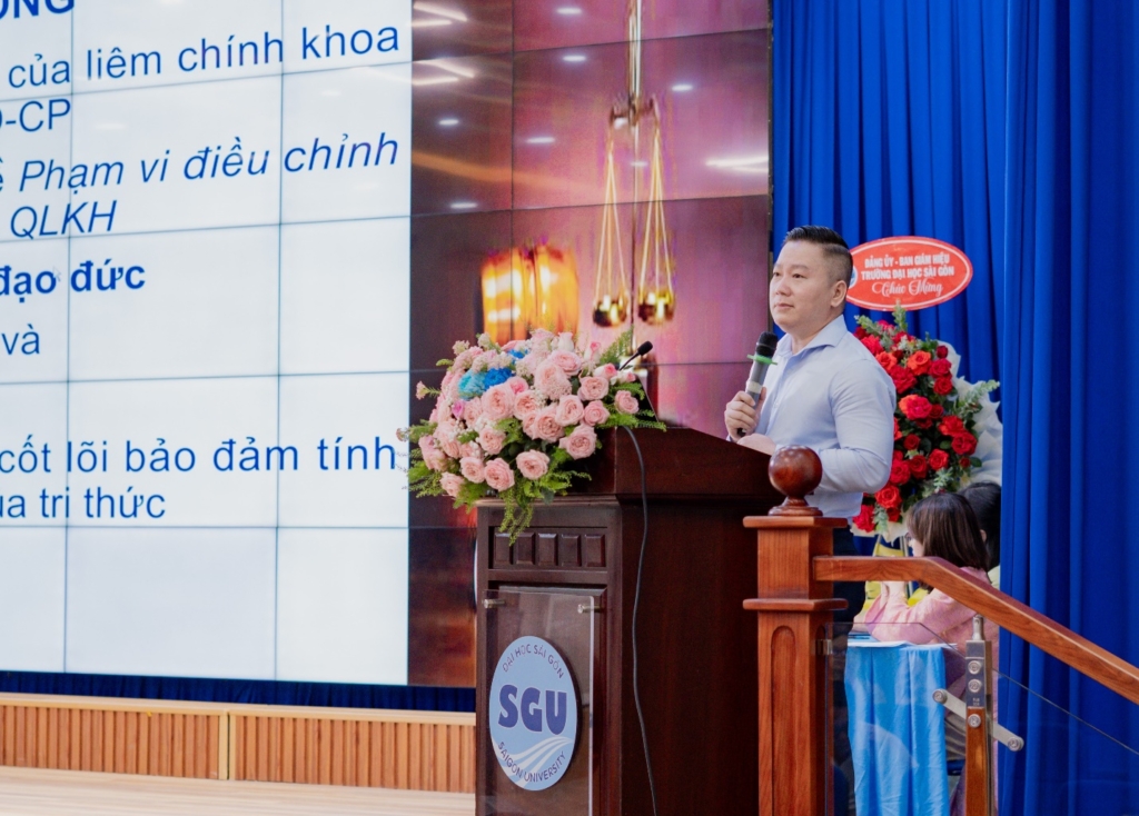 TS. Nguyễn Đức Quyền – Học viện Cán bộ TP.HCM trình bày tham luận “Phân tích khung pháp lý của liêm chính khoa học thông qua Nghị định 262/2025/NĐ-CP – Một số đề xuất”