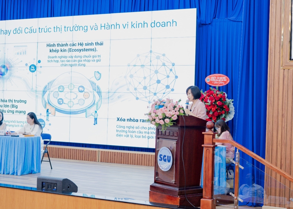 TS. Nguyễn Thị Trâm – Trưởng khoa Xây dựng Đảng, Học viện Chính trị Khu vực II trình bày tham luận “Pháp luật cạnh tranh trong bối cảnh chuyển đổi số và những vấn đề đặt ra cho đào tạo luật”