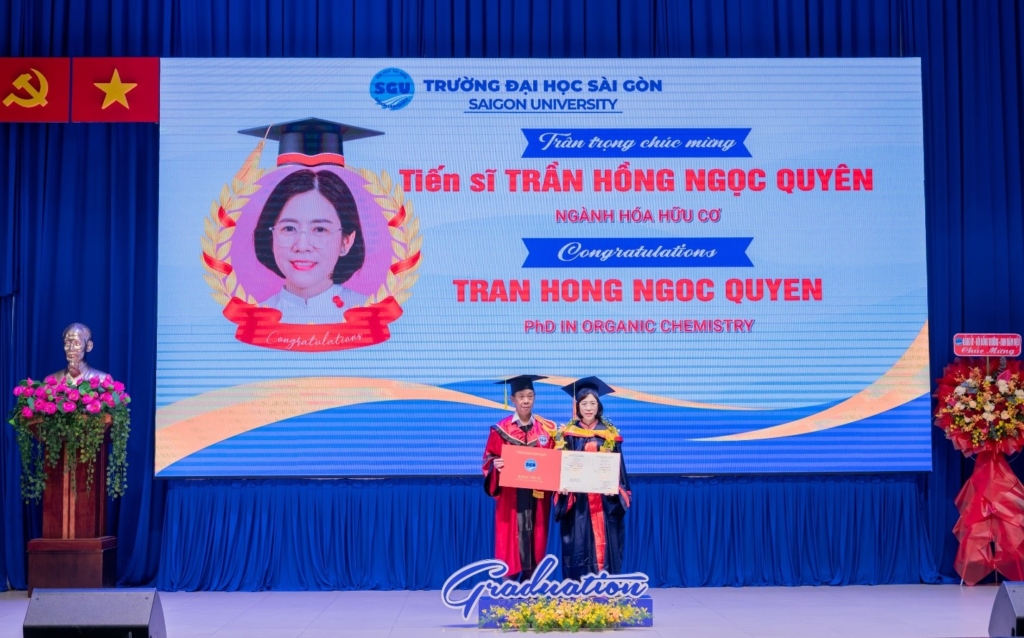 PGS.TS. Phạm Hoàng Quân trao bằng cho Tân tiến sĩ Trần Hồng Ngọc Quyên – Ngành Hóa hữu cơ